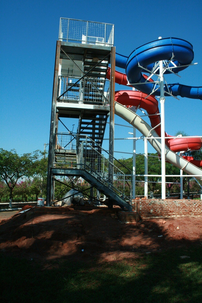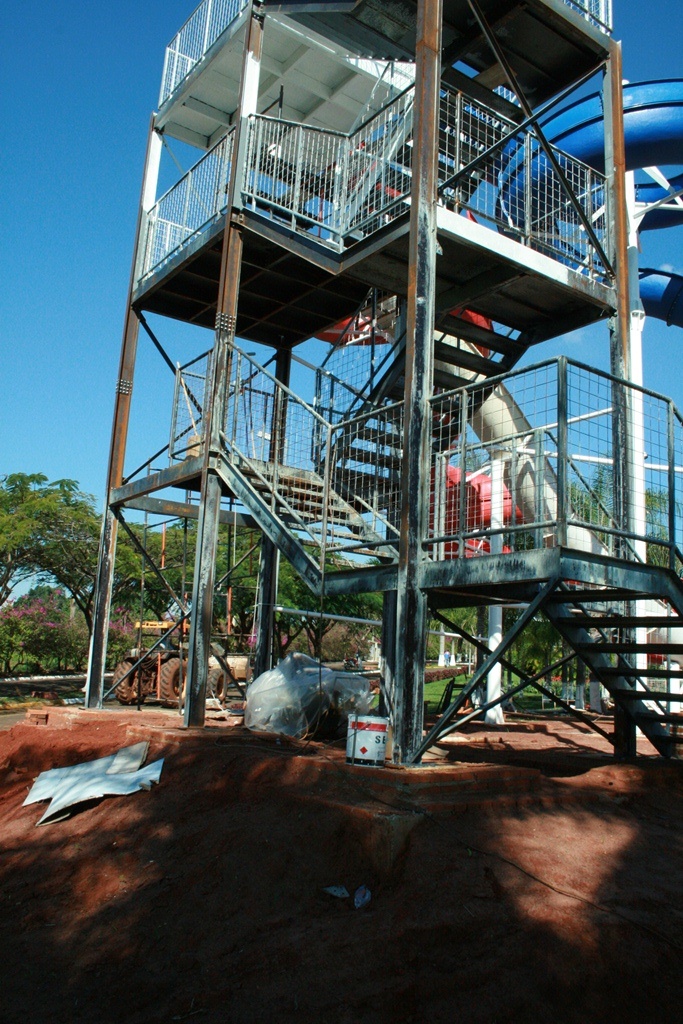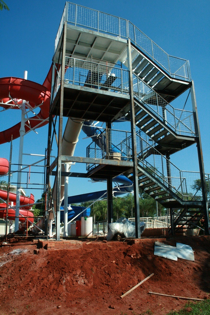 Estrutura de suporte da calha do toboágua e plataforma de acesso.