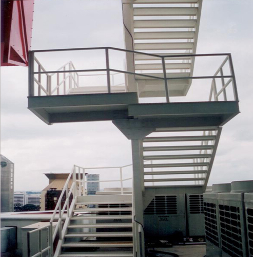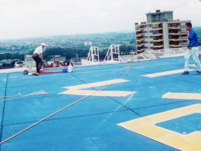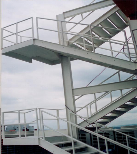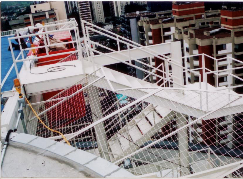 Heliponto elevado em estrutura metálica com piso metálico, escadas de acesso, caixa de incêndio e grade de proteção.