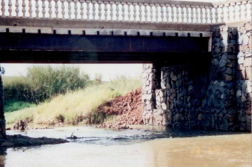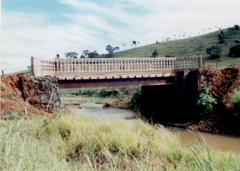 Ponte mista de aço com tabuleiro em concreto e alas em gabião.