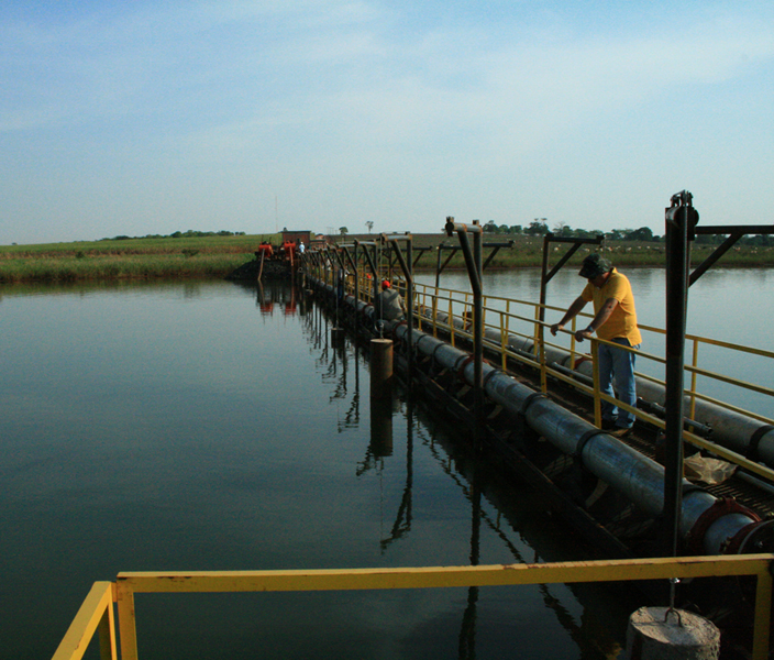 Flutuadores para suporte de sistemas de captação e adução de água bruta, largamente utilizada por indústrias que fazem captação em APP (Área de Preservação Permanente) às margens de lagoas e em sistemas de tratamento de esgoto - ETE (Estação de Tratamento de Esgoto).